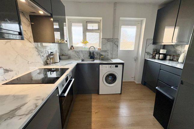 Range of fitted wall and base units. Worktop with inset one & a half bowl single drainer sink unit and mixer tap. Inset electric hob. Extractor cooker hood. ‘Eye’ level electric oven. Integral washing machine. Double glazed window to side aspect.
