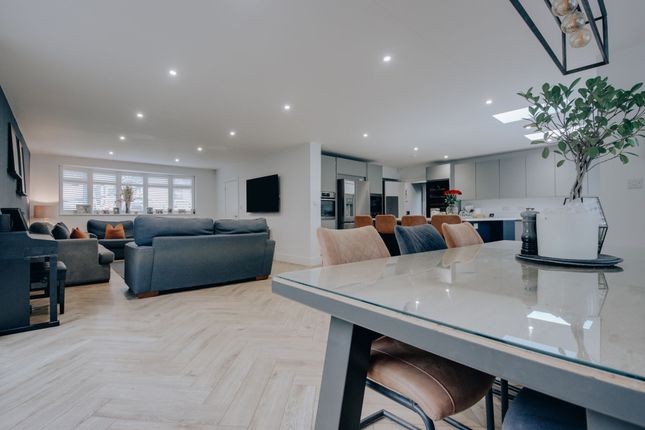 Upon entering you’re greeted by a light and spacious entrance hall with snippets of garden views drawing you through to the principal reception room. This bright double aspect room is currently arranged as a sitting room with two sets of French doors opening on the garden and an inbuilt log burner, a feature of these modern homes. The modern kitchen breakfast room is centrally located for convenience with dining room adjacent to this at the front elevation and a guest WC off the entrance hall.