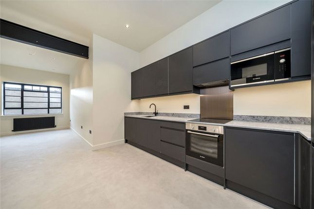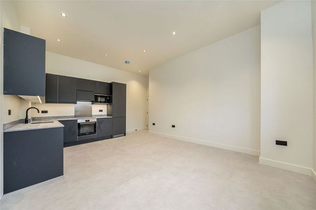 The heart of the home is the open-plan kitchen and living area at the front of the property, where a large bay window floods the space with natural light, creating a bright and welcoming atmosphere. Adjacent to this, the second, smaller double bedroom offers versatility, making it an ideal study, guest room, or nursery. A few steps down lead to the stylish modern bathroom, finished in a neutral white palette and featuring a three-piece suite with a shower over the bath. At the rear of the property, the spacious main bedroom enjoys a peaceful setting, ensuring a quiet retreat from city life.