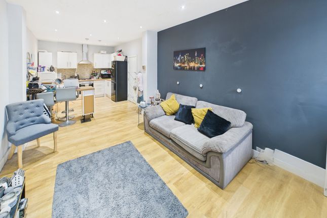 Open plan living with fitted kitchen that features a range of units at base and eye level, space and power for fridge-freezer, integrated cooker with gas hob, integrated washing machine, stainless steel sink with mixer-tap and drainer, roll top work-surfaces, part tiled walls, coving, radiator, double glazed windows to rear aspect.