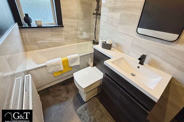 Double glazed window to front, panelled bath, wet room shower area, low flush toilet, pedestal sink, door to first floor landing.