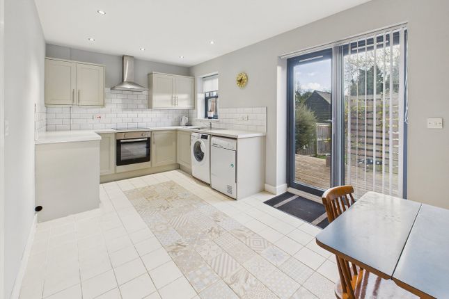 On entering the property, there is the lounge, where an exposed brick fireplace with wood-burning stove creates a warm and inviting atmosphere. An open archway leads into the spacious open-plan kitchen/diner, fitted with modern units and plenty of space for appliances, with French doors opening directly onto the enclosed rear garden, perfect for indoor-outdoor living.
