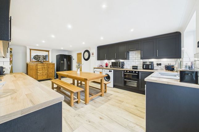 Double glazed window to rear, range of wall and base units, tiled floor, integrated oven, hob and extractor, sink and drainer with mixer tap, wooden worktops, tiled splash backs, spotlights, space for appliances and door to outside.