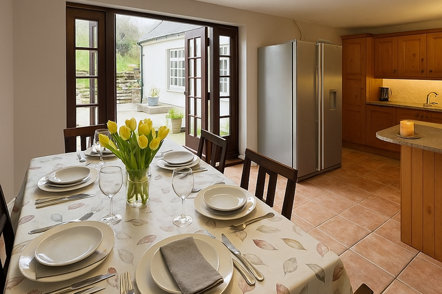 A Gated path leads from the front side of the property, to the fully enclosed Rear where there is a large Garden, laid to lawn and with mature fruit tress and shrubs, an outbuilding and a sun terrace to the Front of the Kitchen. An elevated wooden and glazed summerhouse, takes advantage of the stunning panoramic views. To the rear of the garden is a vegetable patch and greenhouse.