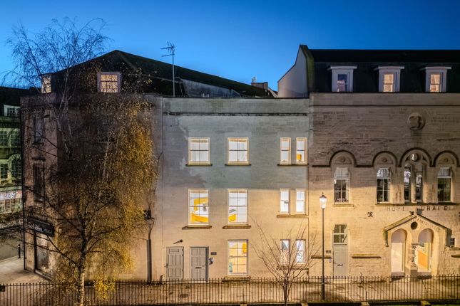 Honed Bath stone exterior with anthracite framed glazing adds a modern and chic contrast to the Georgian backdrop of this stylish home. Precision dry stone walls fuse with a wood effect, ceramic tiled floor and sleek white interior finishes. A hi-tech minimalist kitchen design on the ground floor includes all the necessary appliances with a wine chiller as well as a flush ceiling extractor and concealed power sockets. Light is provided at every possible opportunity, flooding each floor through full depth glazing and roof lights. An enclosed entrance courtyard opens via triple aspect sliding doors to the ground floor accommodation. Comprising an open plan sitting/dining/kitchen space, there is a cloakroom and enclosed stairs to the upper floors. Bespoke door joinery that cleverly matches the radiator designs, is another example of the considered design of this fine property. The first floor provides a principal bedroom with luxuriously appointed dual aspect wet room. Marble tiling to the floor and walls is detailed with gold trim, and a wash bowl sits on a floating plinth. The second floor guest bedroom also has full length windows, along with a dual aspect en-suite bathroom. Equally well fitted with a Lusso Egg bath and further marble tiling to the floor and walls. The second floor landing has stairs to the top floor with fully glazed ceiling and a third bedroom with vaulted roof and spectacular views across the cityscape beyond from a triple aspect outlook.
