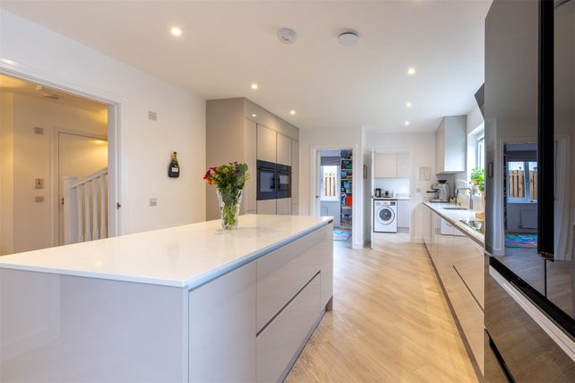 Fully fitted contemporary kitchen exhibiting a fine range of wall and base units, complimentary worktop and stainless-steel sink. Integrated appliances to include fridge/freezer, dishwasher, two electric ovens, five ring induction hob with extractor hood and a free-standing wine fridge.