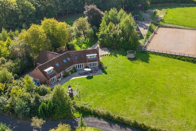 Converted in 1997 to a high specification, this exceptional family residence was once part of a Victorian dairy farm. Accessed via a private stone track, the property enjoys a wonderfully rural and secluded setting, with five acres of mature grounds and landscaped gardens. Just 2.5 miles north of the village of Overton, the location combines countryside tranquillity with excellent nearby local amenities. The main house – converted from a barn built circa 1850 – has been finished to a very high standard, blending period charm with modern comfort. Character features include exposed timbers, vaulted ceilings, flagstone and wood floors, inglenook fireplaces and solid wood doors with traditional style wrought iron fittings. These are complemented by underfloor heating in parts of the ground floor and extensive glazing, flooding the interior with natural light. The impressive open plan kitchen and a separate vaulted central dining room form the heart of the home – both are striking and versatile spaces for family life and entertaining. A second large converted barn – built circa 1750 – extends the appeal of the property, incorporating a triple carport, double garage, a self-contained one bedroom annexe with kitchenette, and a spectacular entertainment space – ideal for hosting larger gatherings or offering additional accommodation. The main property combines elegant contemporary design with period character. The home is entered via a striking glazed porch that floods the space with light and showcases a timber staircase to the first floor. There is a downstairs cloakroom/WC. Glazed doors lead to the superb kitchen/breakfast/sitting room, with double-aspect views over the grounds, a wood-burning stove and further French doors opening to a flagstone sunny south facing patio bordered by flowering shrubs. Refitted in 2021, the kitchen is both elegant and minimalist, with contemporary cabinetry, limestone flooring, ample storage, an integrated oven and large central island with wooden worktop. Across the hall, a laundry room with Belfast sink and white goods area sits opposite a separate study, overlooking the rear gardens. A central passageway leads to a vaulted dining room – a striking space for entertaining, with exposed timbers, period brickwork and abundant natural light. A feature timber staircase leads to the second floor and a glazed door provides access to the rear lawns. The generous family sitting room with inglenook fireplace and log burner is accessed via a corridor, which leads onto a further reception room currently used as a the study/snug/bedroom has a characterful inglenook fireplace with an electric log effect stove.