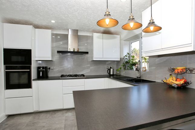 The property is approached via a gravelled driveway for four vehicles, together with additional parking and storage in a single garage. From here, you enter a private courtyard patio with an outdoor store, before stepping into the home itself through French doors into the kitchen or via a single side entrance into the hallway. The kitchen/diner immediately impresses with its vaulted ceiling, exposed beams and stylish contemporary finish. The fitted kitchen includes high-end integrated appliances such as Neff slide-and-hide oven doors and a matching microwave, along with a central island and ample space for dining furniture. This fantastic area is ideal for entertaining and family meals, with two sets of French doors leading onto a private decking area, creating a wonderful open flow for summer gatherings.