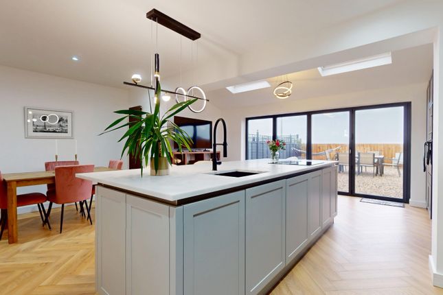 At the rear of the property, a bright extended dining room offers the perfect space for family meals and entertaining. Surrounded by windows and featuring French doors leading out to the garden, this room provides a seamless connection between indoor and outdoor living. With spotlights overhead, the space feels fresh, welcoming, and versatile.