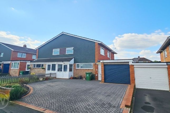 The property is set behind a large, mainly lawned front garden with mature borders containing a variety of shrubs and plants. A private driveway provides off-road parking for multiple vehicles and leads to a good-sized single garage.