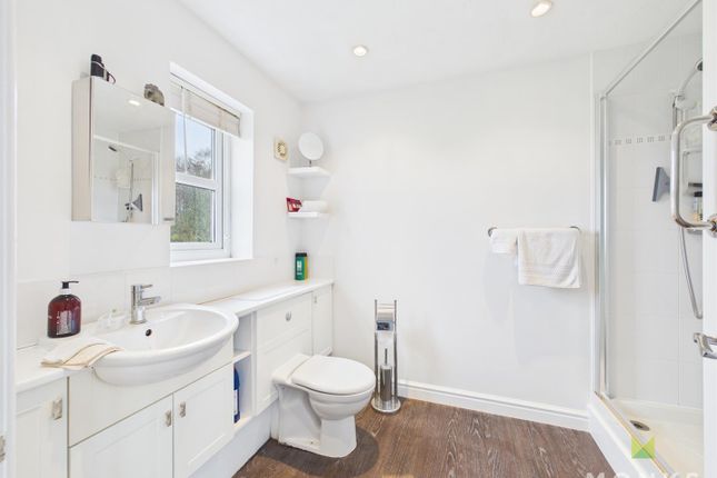 Refitted suite with granite worktops, comprising WC, wash basin, shower cubicle, towel radiator, double glazed window.