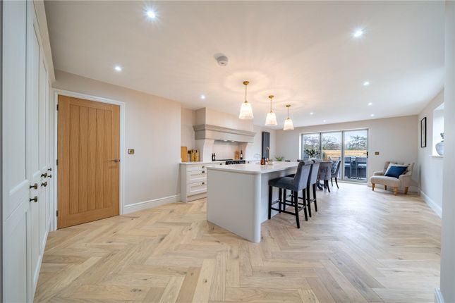 The kitchen is beautifully appointed with a generous range of Shaker style units finished in heritage colours providing a fantastic level of storage as well as having a generous run of quartz preparation surfaces including a central island unit which again provides additional storage and a breakfast bar for informal dining. Integrated appliances include Franke induction hob, Neff fan assisted oven and combination microwave, full height fridge and freezer and under counter dishwasher. The kitchen also having twin bowel Rangemaster ceramic sink with brush metal swan neck mixer tap, inset downlighters to the ceiling, tiled floor with a part wet and part electric underfloor heating system and double glazed windows to the rear. The kitchen in turn is open plan to a living/dining space which provides a versatile reception area with French doors leading out into the rear garden.