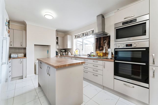 With a fitted range of modern base units and drawers with work surfaces over to two sides, matching wall units, inset stainless steel sink with mixer tap over, built in under oven with hob and extractor over, spaces for washing machine and fridge/freezer, radiator and double doors opening to rear.