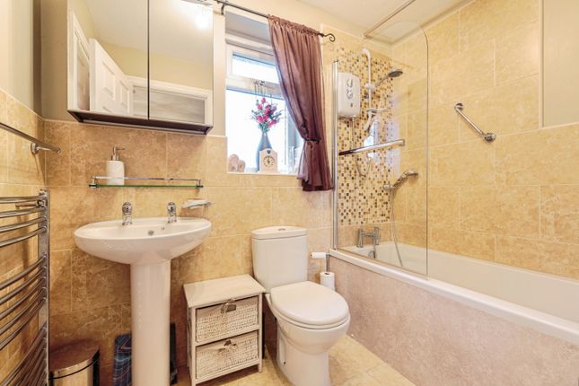 Modern family bathroom briefly comprising 'P' shaped bath with shower over and shower screen, pedestal hand wash basin and low flush toilet. Walls and floor are tiled.