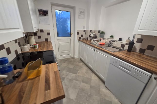 Two windows to rear elevation, a range of wall and base units with work surface over incorporating a sink with drainer unit, two integrated oven and hobs, central heating radiator, storage, spotlights and central heating radiator.