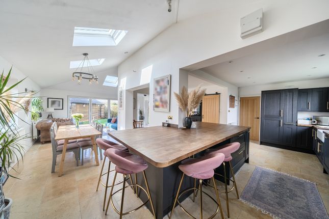 Spacious, open plan living is at the heart of this home, with a fantastic large double aspect kitchen, dining and family room with bifold doors opening to the garden, Stovax woodburning stove and oak flooring throughout. The kitchen has been recently re-fitted and has quartz worktops and appliances including induction hob, oven, microwave, fridge freezer and dishwasher.