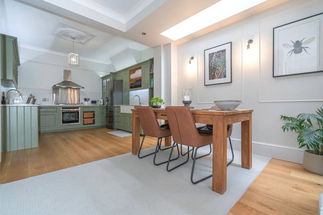 The plan unfolds naturally onto a sociable open-plan reception area, which occupies the entirety of this floor. The sitting room is at the front, framed by a tall window overlooking the front garden. A pivot door swings to close this area from the front door, while a WC with marble sink lies just behind.