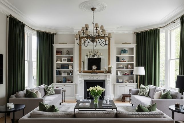 Generous reception room with patio doors leading to beautiful mature communal gardens