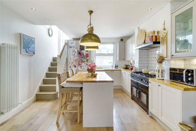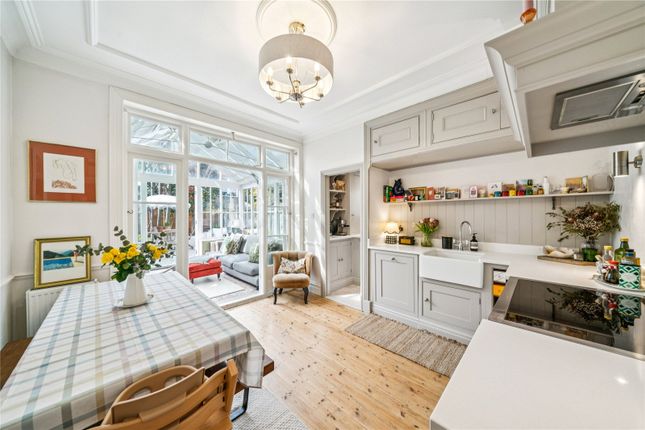The final floor of the property comprises the expansive open-plan kitchen and second reception room. The industrial-style kitchen is on trend and offers generous storage and surface space with high-quality appliances, including a dual-fuel range cooker, plus a discreet utility area keeping additional appliances neatly out of sight. The reception space that the kitchen opens onto is perfect for a casual lounge area, whilst still providing great dimensions for a large dining table. The space is cool in the summer and warm in the winter as it boasts underfloor heating and an electric fireplace for added cosiness. This level also provides further access to outdoors, adding to the pleasant atmosphere as fresh air can circulate through two sets of French doors.