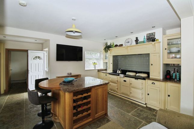 The kitchen is a generous and welcoming space that lends itself to family life, with extensive timber cabinetry providing abundant storage and long work surfaces arranged for practical everyday use. Colourful tiled splashbacks frame the room and complement the traditional range cooker, which forms an attractive focal point for those who enjoy cooking.