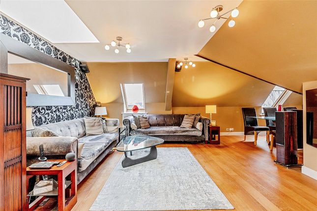 The living room is a spacious and light-filled room at the front of the building. A large bay window allows natural light to flood this room, while ornate cornicing and a period fireplace add warmth and character. Built-in shelving in one of the alcoves provides a practical addition without compromising style.