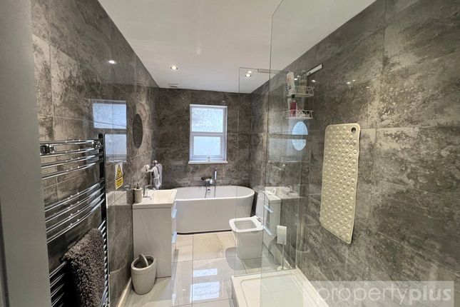 Luxury family bathroom featuring contemporary tiling and fittings.