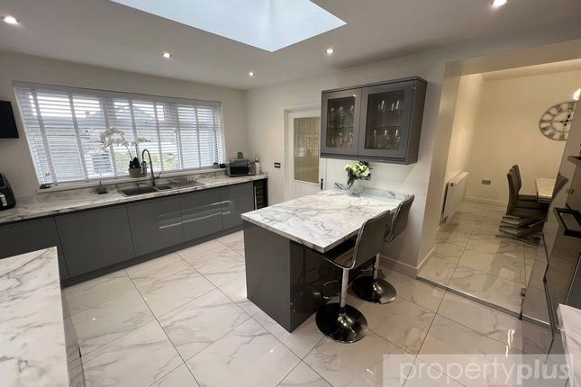Kitchen/Breakfast Room: 2.61m x 4.49m (approx.) – UPVC window and door to rear, farmhouse-style fitted kitchen with ample wall and base units, breakfast bar, and freestanding electric cooker.