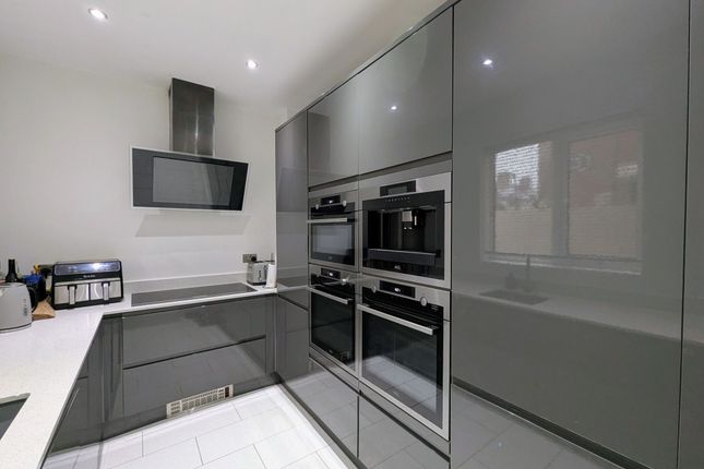 Range of wall and floor units with contrasting work surfaces, tiled floor, spotlights to ceiling, integrated oven, integrated microwave, integrated fridge/freezer, dish washer, warming tray, two UPVC double glazed windows with blinds, french doors with perfect fit blinds and radiator.