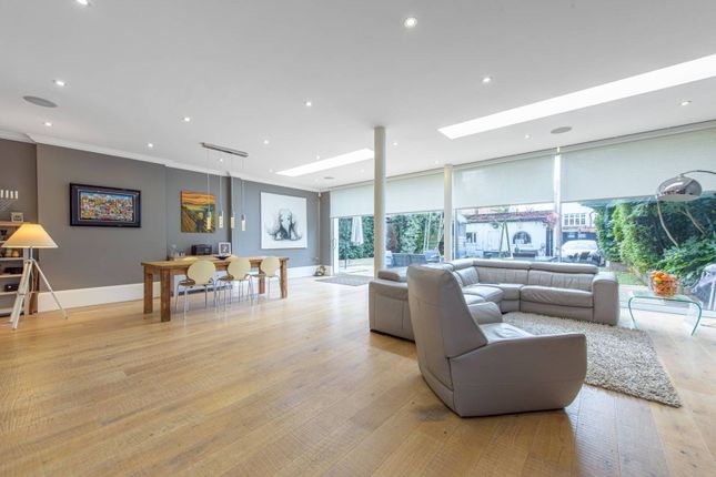 At the heart of the home lies an elegant reception space of impressive proportions. Framed by generous ceiling heights and natural light, the room has been carefully configured to allow for both large-scale entertaining and intimate everyday living. Enhanced by integrated surround sound and a discreet cinema projector, this space effortlessly transforms into a home cinema for immersive viewing experiences. The flow from this area towards the rear of the property is particularly striking: A gentle sequence of levels leads out into the garden and towards a truly unique two story garden studio.