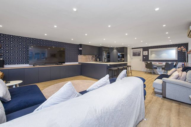 The ground floor features stylish wooden flooring throughout, with a modern fitted kitchen to the front and a bright, south-facing living room opening onto the rear garden via French doors.