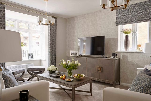 A spacious living room provides an ideal family gathering space, showcasing an exposed brick feature wall and an attractive fireplace with wood-burning stove. A bay window to the side aspect allows an abundance of natural light to flood the room, while the generous proportions comfortably accommodate seating for the whole family.