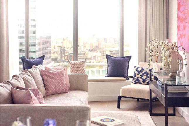 39th floor two bedroom two bathroom luxury apartment, measuring 899 sqft (84 sqm). Dressed in a neutral colour palette featuring Integrated Siemens appliances including a wine cooler, comfort cooling and underfloor heating throughout and floor to ceiling windows boasting of North East views towards Wood Wharf.