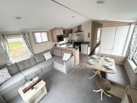 The inviting open-plan living area provides a welcoming environment for relaxation and entertaining, complemented by a modern fitted kitchen equipped with ample storage and worktop space, perfect for preparing meals after a day exploring the stunning coastline. The main bedroom benefits from an en-suite WC for added privacy and convenience, while a further twin bedroom ensures comfortable accommodation for guests or family members. Super fast Wifi is also available for an extra charge of £15 per month.