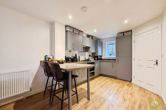 The ground floor comprises a welcoming entrance porch leading into a spacious living room, which is beautifully presented with a light, neutral colour scheme and fitted carpeting. To the rear is a stylish open-plan kitchen/diner, designed with contemporary shaker-style units, spot lighting, and practical vinyl flooring. The kitchen is well equipped with integrated appliances including a fridge/freezer and oven with induction hob, while French doors open directly onto the rear garden, creating an ideal space for both everyday living and entertaining. A convenient ground-floor WC completes this level.