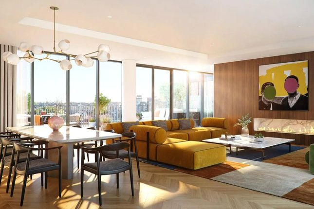 Upon entering the apartment you are greeted with stunning 13ft ceilings and bespoke arched doors and opening directly into a generous reception room that stretches across three floor to ceiling sash windows. Light pours in from the west, this impressive reception space is complete with Venetian glass chandeliers and beautiful herringbone floors complete with underfloor heating giving the space an easy, airy elegance. There is plenty of room here for both living and dining spaces, with the proportions and ceiling height creating a natural sense of separation without ever feeling formal. Doors open onto a private balcony, wide enough for a table and chairs and perfect for an evening drink.