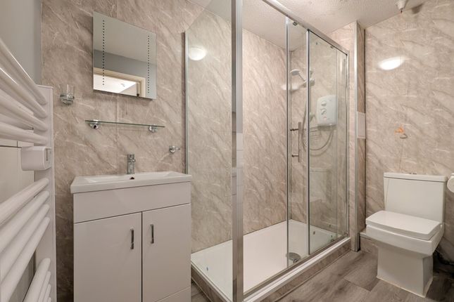 Tiled and fitted with stainless steel sink unit, wall and floor cupboards with work tops. Oven and halogen hob with extractor fan over. Electric fan heater. Space for fridge/freezer. Emergency pull cord, power points. Strip light.