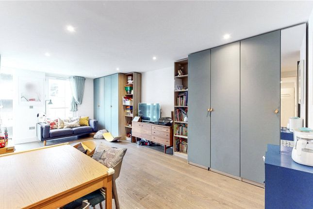 Accessed on the ground floor via the private garden, the apartment opens into a generous living and kitchen area. Natural light floods the room on bright days and is enhanced by an understated, neutral scheme, with a considered palette of tones from Paper & Paint Library, Dulux Heritage, and Farrow & Ball used throughout. The kitchen features white cabinetry, Amtico flooring, a Corian worktop, and a Bosch dishwasher, with Philips Hue LED strips discreetly installed above the counters for atmospheric lighting.