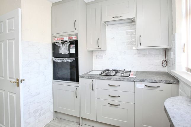 A fully fitted kitchen in white with coordinating work surfaces and tiling to splash back areas. One and a half bowl stainless steel sink with drainer and mixer tap. Integrated gas hob with electric oven. Plumbing for automatic washing machine. Artexed and coved ceiling with spot lights. Ceramic tiled floor. UPVC double glazed window to front. Storage cupboard.