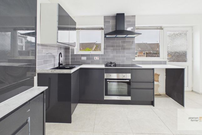 Neutral decor, vinyl flooring, a range of wall and base units, integrated oven & hob, ss sink & drainer, UPVC window, UPVC rear door into the garden, radiator