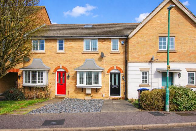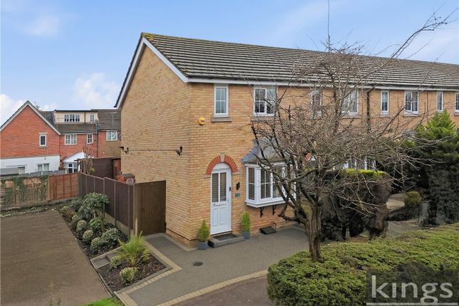 The property is approached via a footpath overlooking a green communal area, with the front elevation set back behind low-maintenance planting and benefiting from its end-of-terrace position, allowing for a more open aspect compared to mid-terrace homes.