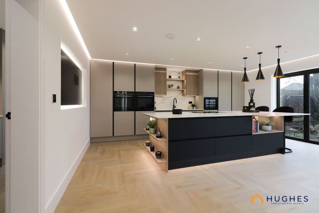The main bedroom also benefits from a fully-tiled modern en-suite shower room with shower, toilet, sink, storage and towel radiator. Bedrooms two and three are generous doubles, each rear-facing with open field and garden views; bedroom two also includes fitted wardrobes. Bedroom four is a further double overlooking the front of the property, complete with fitted wardrobes, additional storage, and views across to Linacre Woods. Bedroom five is ideally suited as a study, nursery, or walk-in dressing room. The fully tiled family bathroom offers a four-piece suite with underfloor heating, including Porcelanosa fittings comprising a large bath, spacious separate shower, sink and towel radiator.