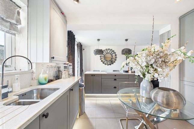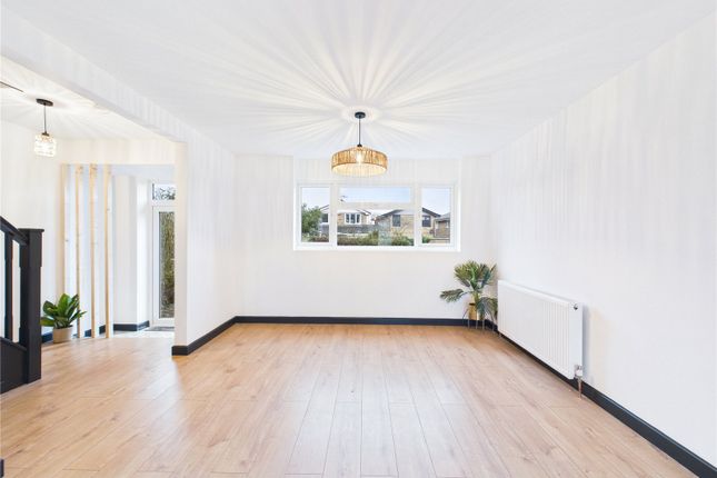 The ground floor begins with a hallway that includes stairs to the first floor and leads into the primary living spaces. To the front, the living room features a beautiful bay window that adds a sense of space and light. Directly behind this is a separate dining room, perfect for family meals or entertaining, with double doors that open out onto the garden. The long, dedicated kitchen sits adjacent to the dining room, providing a practical workspace for the home cook with its own separate access point.