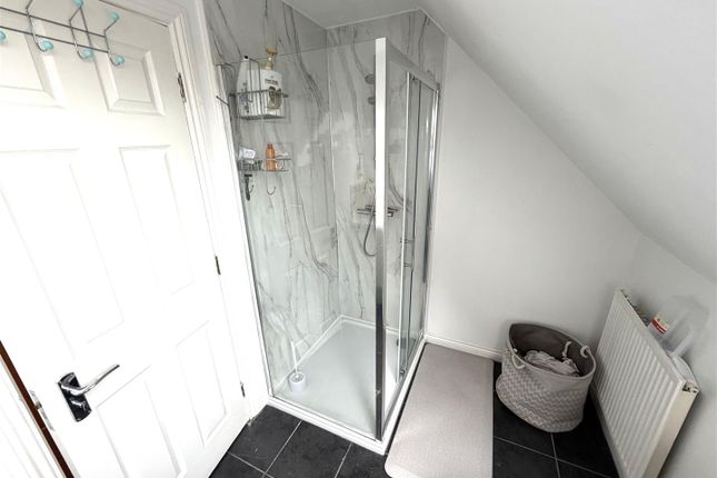 Double glazed frosted window to front aspect. White suite comprising 'p' shaped bath with rainwater shower over, further separate shower attachment, wash hand basin, wc. Heated towel rail. Airing cupboard with wall mounted gas boiler.
