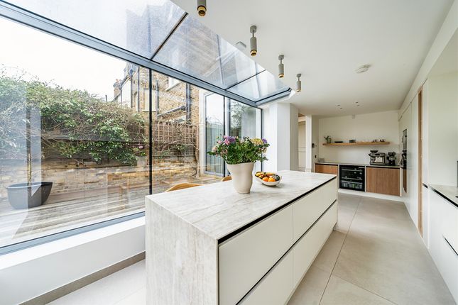 The ground floor is centred around a striking open-plan kitchen and dining room that forms the true heart of the home. Flooded with natural light from rooflights and full-width glazed doors, the space is ideal for both everyday family living and entertaining. The contemporary kitchen features extensive cabinetry, quality integrated appliances and a substantial central island, while doors open directly onto a generous, private rear garden, creating a seamless connection between inside and out. To the front of the house, a separate reception room provides a more intimate and elegant living space, showcasing a feature fireplace, bespoke cabinetry and beautiful wooden flooring. A well-appointed utility room completes the ground floor.