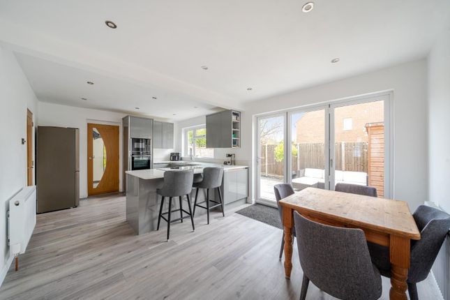 The house is approached via a generous reception hall, creating an immediate sense of space and quality. A striking oak and glazed staircase provides an architectural focal point and sets the tone for the finish throughout. To the rear, the principal reception space is arranged in an open-plan format, ideally suited to modern living and entertaining. The kitchen is fitted with sleek cabinetry and a comprehensive range of integrated appliances, while French doors open directly onto the south-facing garden, ensuring an excellent connection between the internal and external spaces.
