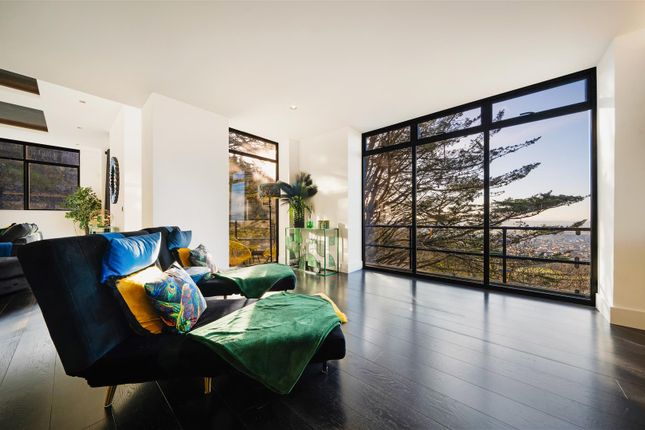 The first floor landing is an attractive space in its own right, opening onto a broad roof terrace with glass balustrading and outstanding views, creating an ideal entertaining area. The principal bedroom suite features fitted wardrobes, French doors to a Juliette balcony, and a luxurious bathroom with freestanding bath, walk-in shower and twin basins.