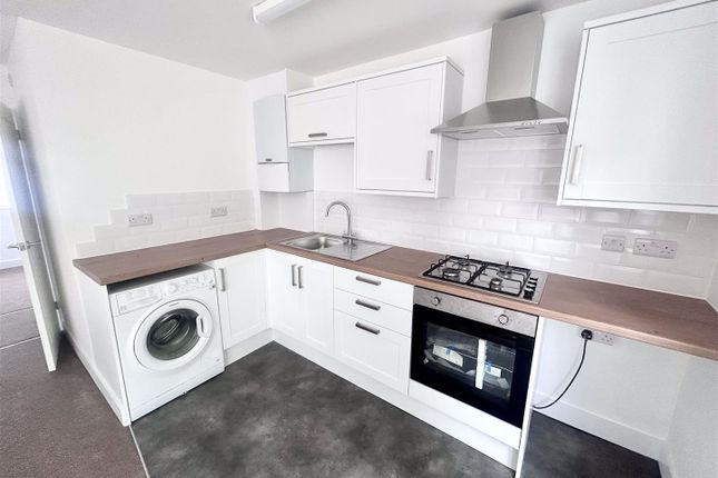 The kitchen is sleek and modern, fitted with grey gloss cabinets and black countertops for a clean and stylish look. A bright blue glass splashback adds a pop of colour and contemporary flair. Appliances include a built-in oven and extractor hood, with small appliances such as a microwave and toaster neatly arranged on the counter. The space is well-lit and functional, offering ample storage and work surfaces for cooking.
