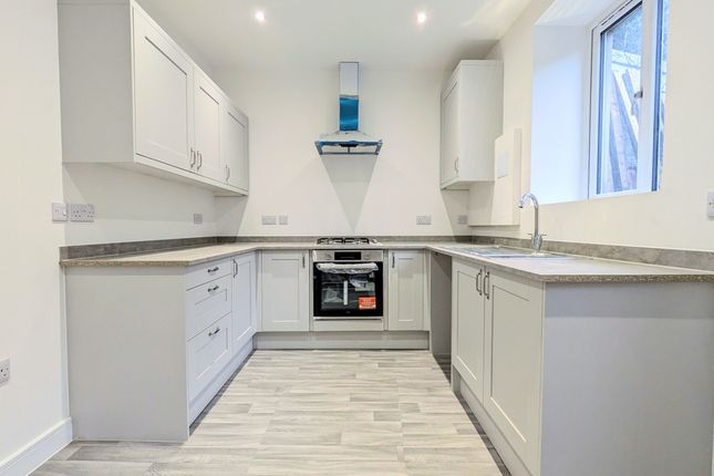 Fitted with a range of white wall and base units complemented by contrasting work surfaces. The kitchen features a polystyrene tiled ceiling, a combination of emulsion-finished and tiled walls and tiled flooring. There is a built-in oven and hob with extractor fan above, a stainless steel sink unit, and plumbing in place for an automatic washing machine. A radiator and ample power points are provided. A uPVC window overlooks the rear, with a uPVC door giving direct access to the exterior.