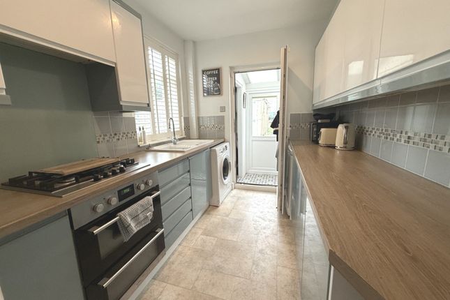 Double glazed timber window to rear elevation, a range of fitted wall and base units with rolled edge work surfaces incorporating stainless steel single drainer sink unit with mixer tap and tiled splash backs, built-in electric oven with four ring gas hob and fitted cooker hood over, plumbing for automatic washing machine, space for upright fridge/freezer, wall extractor fan, power points.