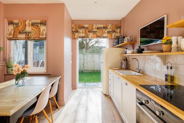The front door opens to a generous entrance room with a door to access the garden, a great space for a desk/coats and boots. There is a tall pantry cupboard and plumbing and space for a washing machine/tumble dryer. A glass door opens to the fantastic open plan living space with vaulted ceilings and 'Velux' windows for that extra wow factor. The kitchen/dining room has an exposed brick wall with tongue and groove to waist height adding to the cottage feel. The kitchen cupboards are sage green in 'Shaker' style and includes an integrated slimline dishwasher, oven, hob and extractor hood. This inviting area opens to the cosy sitting room with a wood burner for those chilly nights. Sliding patio doors open out to a lovely terrace and the pretty south facing garden.